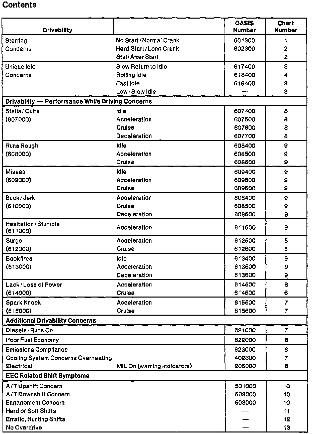 Select a symptom from the chart. For multiple symptoms, select the symptom that is most evident. Go to the chart number listed and perform the visual/mechanical and EEC checks in the suggested order.