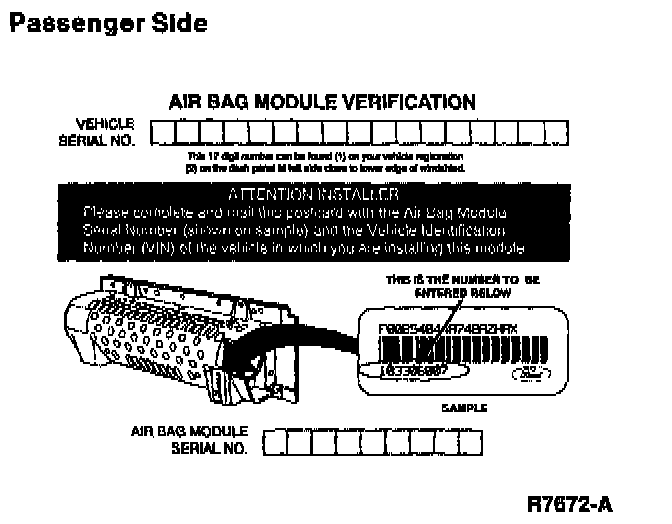 When replacing an air bag module, a prepaid return postcard is provided with the replacement air bag module. The serial number for the new part and Vehicle Identification Number (VIN) must be recorded and sent to Ford Motor Company.