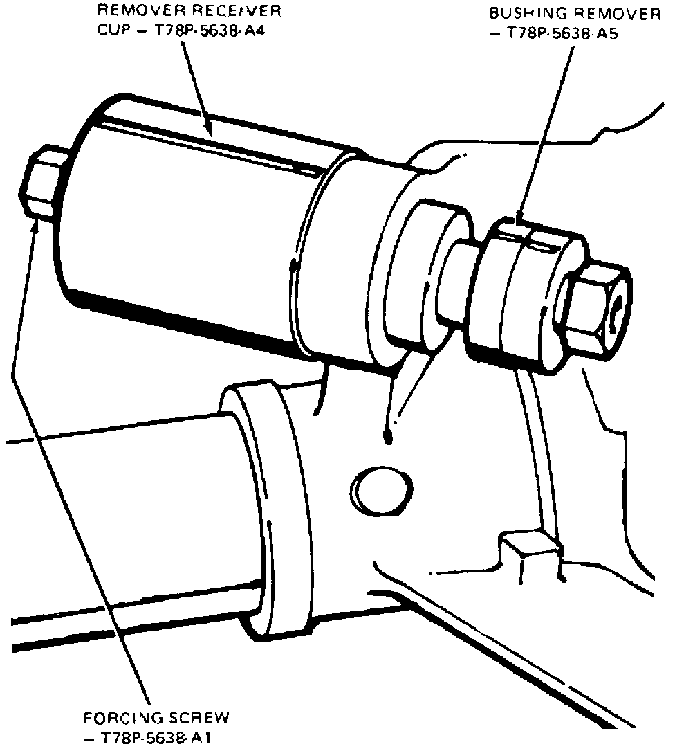 2. Place bushing remover and installer set T78P-5638-A, or equivalent, as shown, and remove bushing.