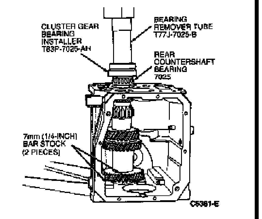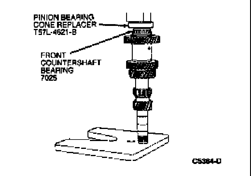 1. Using a press, install front countershaft bearing (7025) onto countershaft cluster gear (7113) using Pinion Bearing Cone Replacer T57L-4621-B.