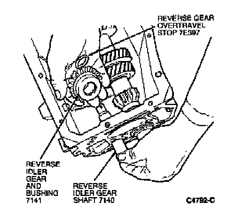 Install reverse idler gear shaft (7140) and reverse gear overtravel stop (7E397) . Install reverse idler gear shaft from rear of case and position reverse gear overtravel stop between reverse idler gear and bushing and reverse idler gear shaft .