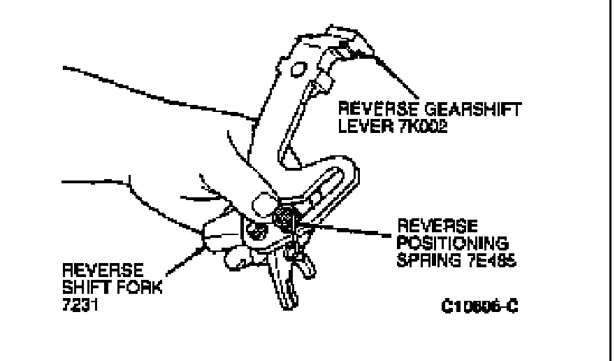 10. Align reverse gearshift lever (7K002), reverse shift fork (7231) and reverse positioning spring as shown.
