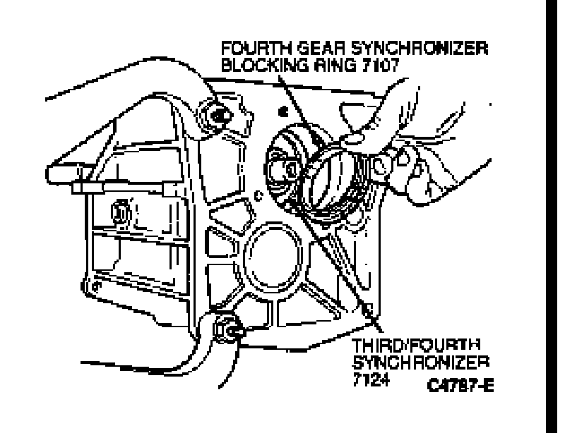 15. Align notches in synchronizer blocking ring (7107) with synchronizer hub inserts (7A044) in three/four synchronizer (7124) and install synchronizer blocking ring .
