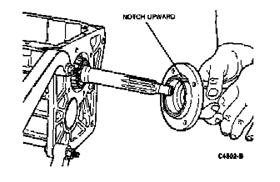Install main drive gear bearing retainer with narrow or smaller notch facing upward, and tighten retaining bolts to 15-27 Nm (11-20 lb-ft). Check end play.