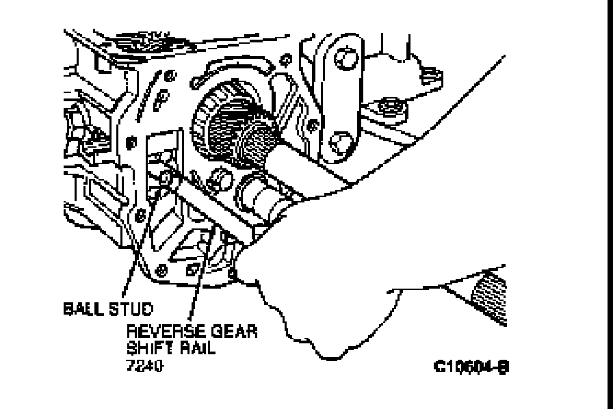 21. Install reverse gear shift rail (7240) into transmission case by aligning ball stud with slot in case and aligning reverse gear shift rail with reverse shift fork. Once ball stud enters case, rotate reverse gear shift rail clockwise and push in reverse gear shift rail until ball aligns with reverse gearshift lever. Rotate reverse gear shift rail counterclockwise until ball stud fully engages reverse gearshift lever.