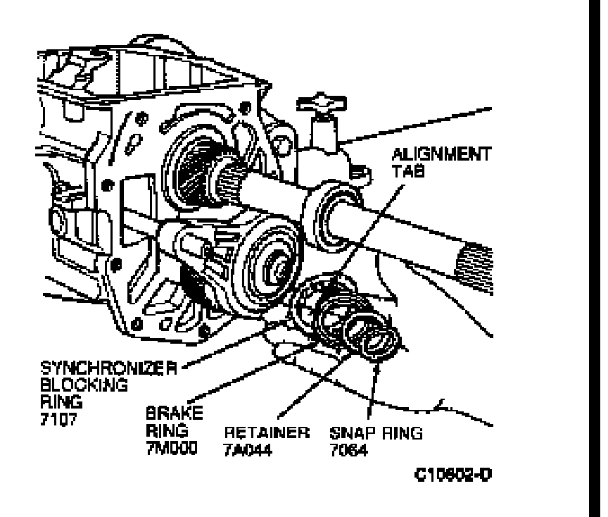 Install synchronizer blocking ring, brake ring, retainer and fifth gear synchronizer snap ring (7064).