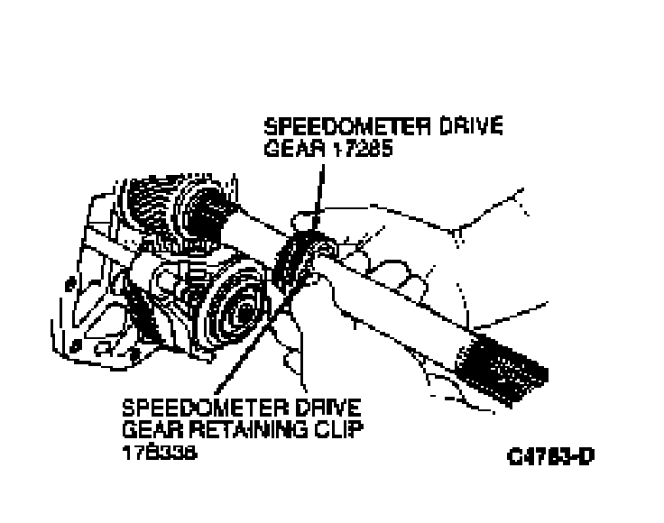 26. NOTE:The tab on the speedometer drive gear retaining clip (17B336) engages a hole in the output and fifth gear drive shaft .