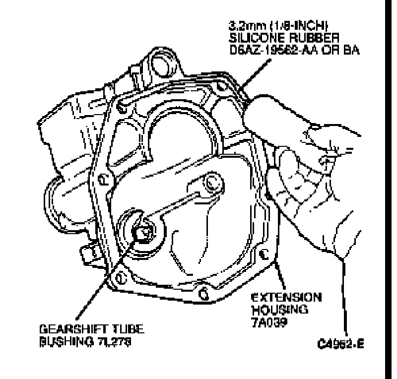 Apply a 3.2mm (1/8-inch) bead of Silicone Rubber D6AZ-19562-AA or BA or equivalent meeting Ford specification ESB-M4G92-A and ESE-M4G195-A on the extension housing mating surface. Apply Silicone Rubber D6AZ-19562-AA or BA or equivalent meeting Ford specification ESB-M4G92-A and ESE-M4G195-A to the oil pickup funnel and install funnel to extension housing.