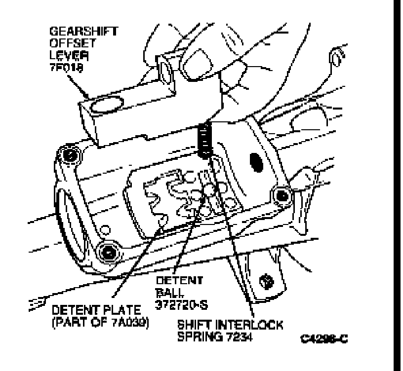 30. Coat shifter interlock spring (7234) with petroleum jelly and install in gearshift offset lever (7F018). Lubricate detent plate and install detent ball in neutral position on plate. Position gearshift offset lever in extension housing with shifter interlock spring over detent ball.