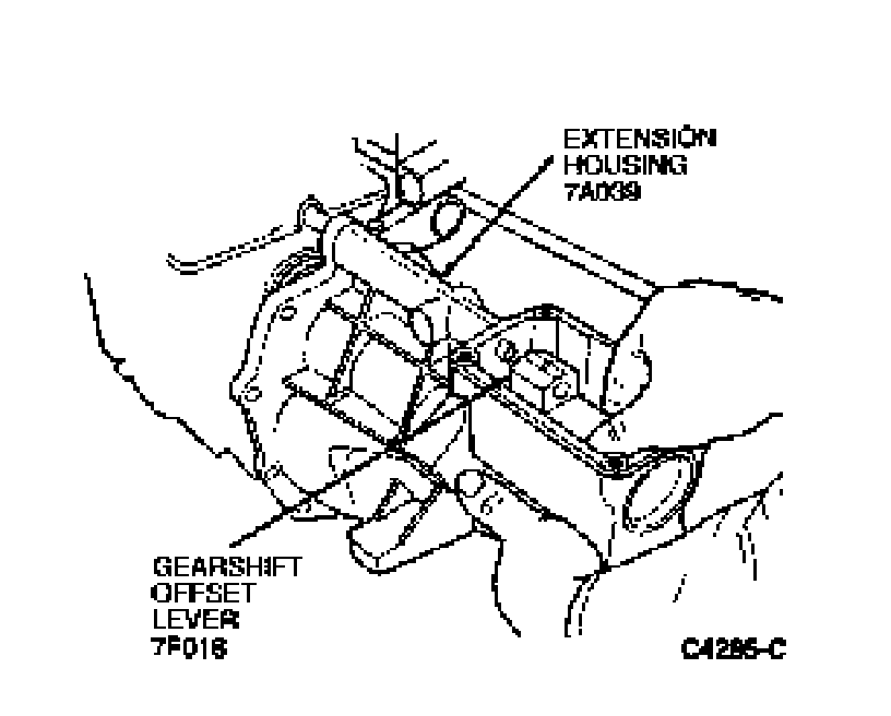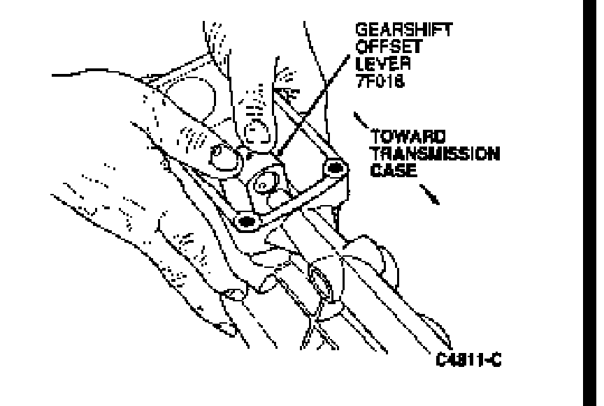 32. Press downward on gearshift offset lever to compress shifter interlock spring and push gearshift offset lever and extension housing into position.