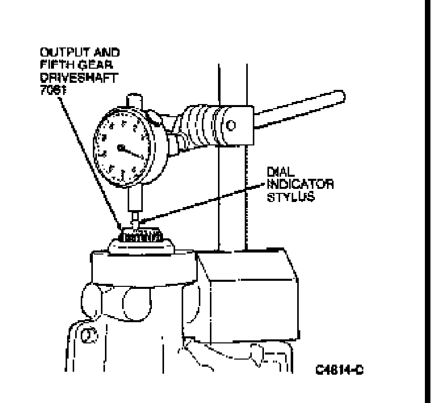 c. Rotate the input shaft and output and fifth gear drive shafts. Zero the dial indicator.
