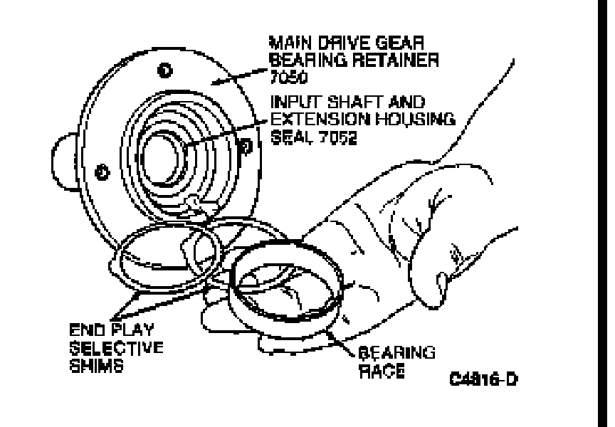 Rotate transmission to the horizontal position and remove the main drive gear bearing retainer. Remove bearing race from main drive gear bearing retainer and install the necessary shim(s).