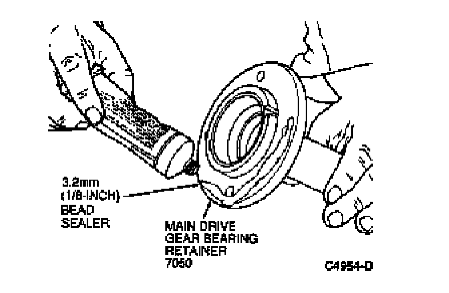 Apply a 3.2mm (1/8 inch) bead of Silicone Rubber D6AZ-19562-AA or BA or equivalent meeting Ford specification ESB-M4G92-A and ESE-M4G195-A to main drive gear bearing retainer.