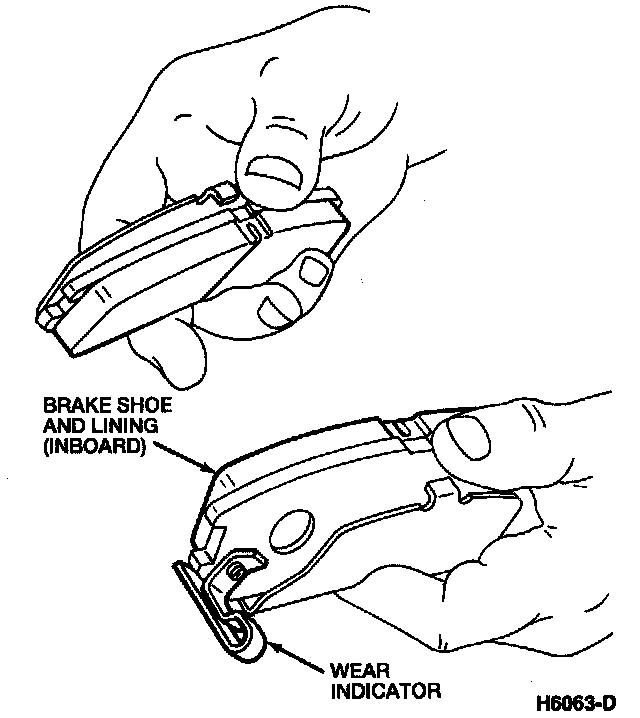 2. Install the brake shoes and linings into the front disc brake caliper anchor plate. The brake shoe and lining with the wear indicator is the INBOARD brake shoe and lining.