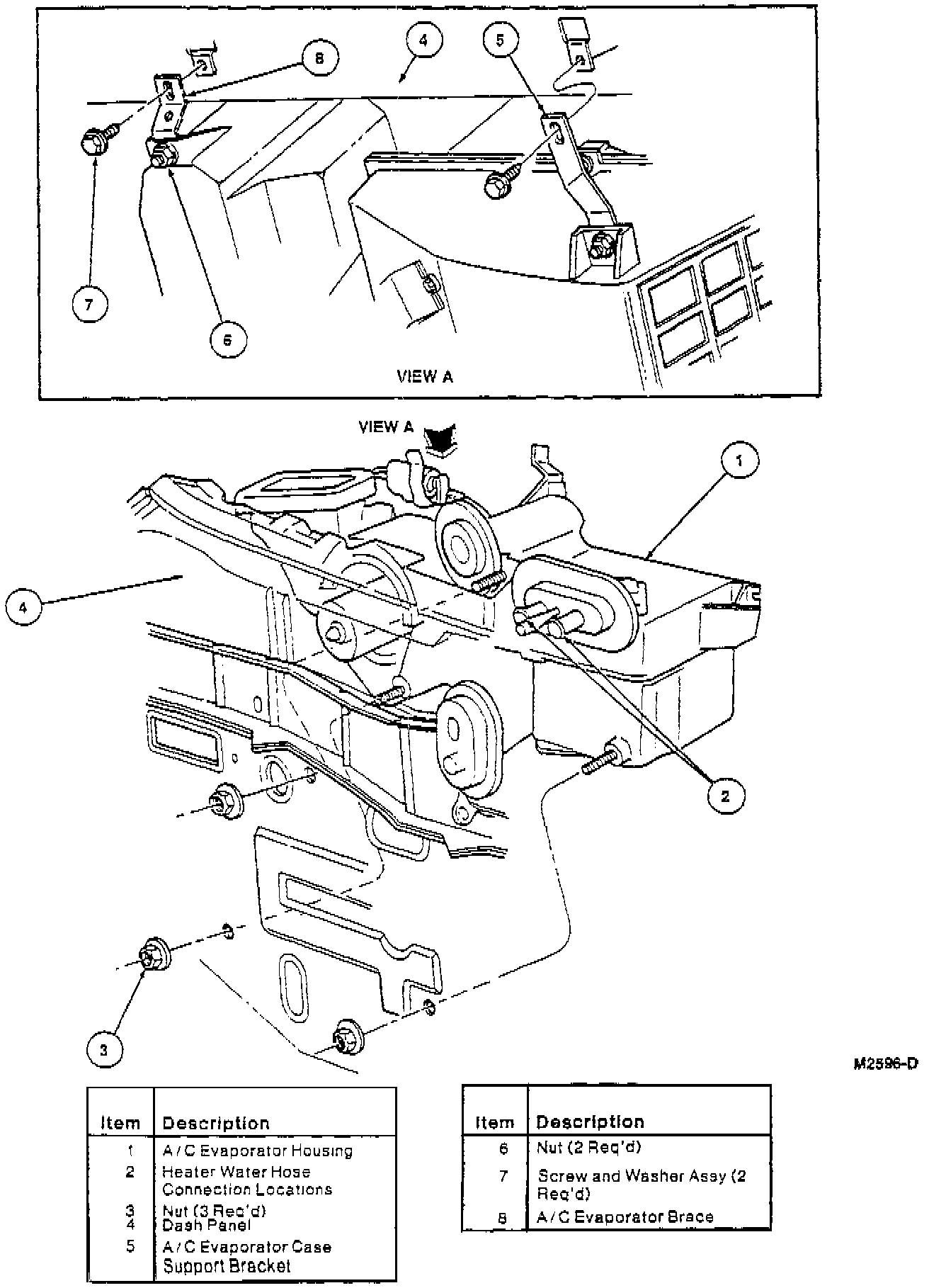 1. Carefully install the A/C evaporator housing in the vehicle, the heater core case to the dash panel, and install the two screws retaining the support brackets to the cowl top panel.