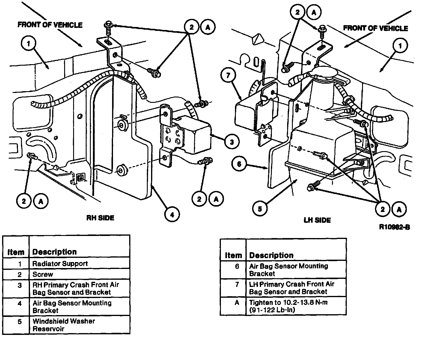 1. Position RH primary crash front air bag sensor and bracket to air bag sensor mounting bracket or LH primary crash front air bag sensor and bracket to air bag sensor mounting bracket in vehicle and secure with RH or LH primary crash sensor-to-grille opening reinforcement bracket screws. Tighten screws to 10.2-13.8 Nm (91-122 lb in).