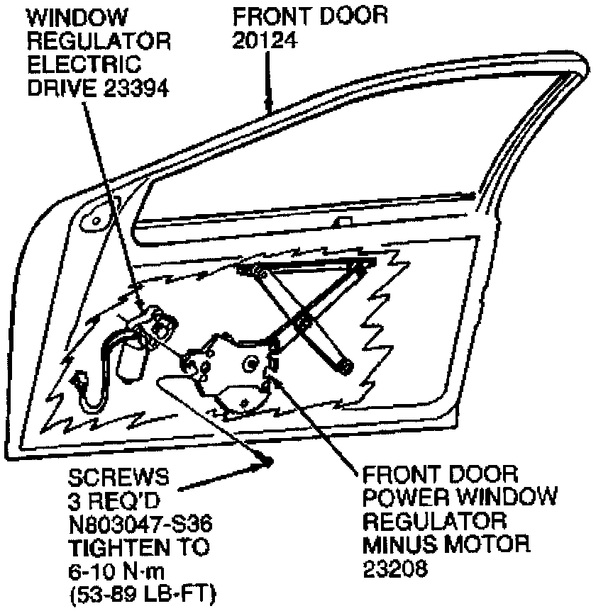 2. Connect the body main wiring at the connector and cycle the window regulator electric drive to verify gear engagement. After the gears are engaged, tighten the three window regulator electric drive retaining screws to 6-10 N-m (53-89 lb-in).