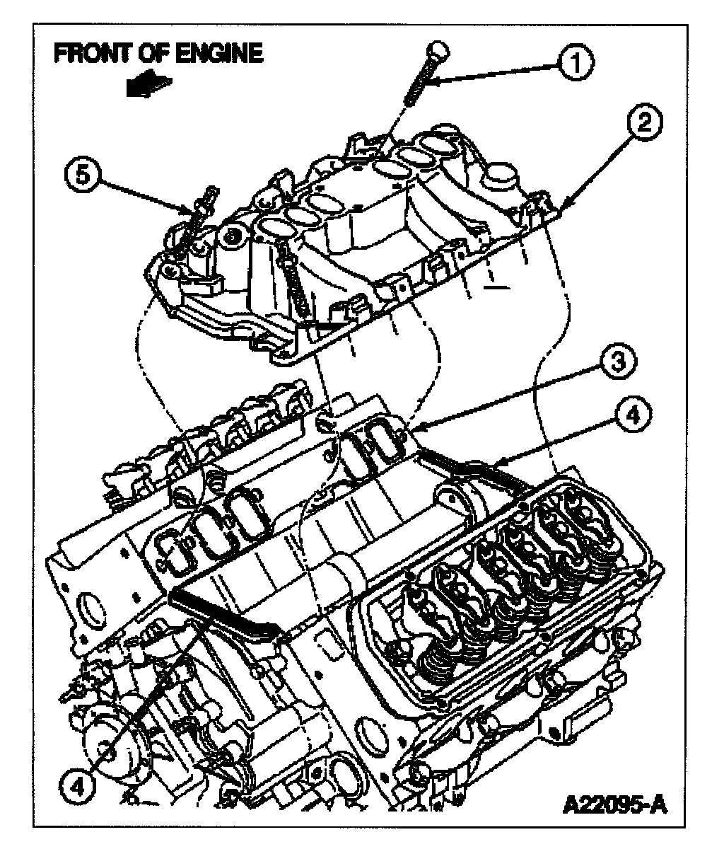 1. The lower intake manifold, cylinder head, and cylinder block mating surfaces should be clean and free of old gasketing material. Use a suitable solvent to clean these surfaces.