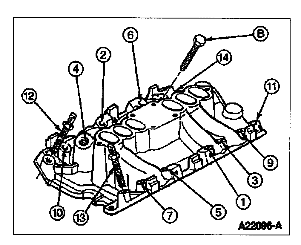 7. Install bolts in their original locations. Tighten in numerical sequence as shown in the following illustration to the following specifications in two steps: