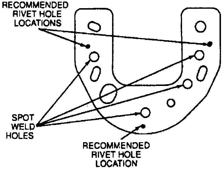 9. Install three 1/8 inch diameter pop rivets with a grip range of 1/4 inch into alignment plate/strut tower.