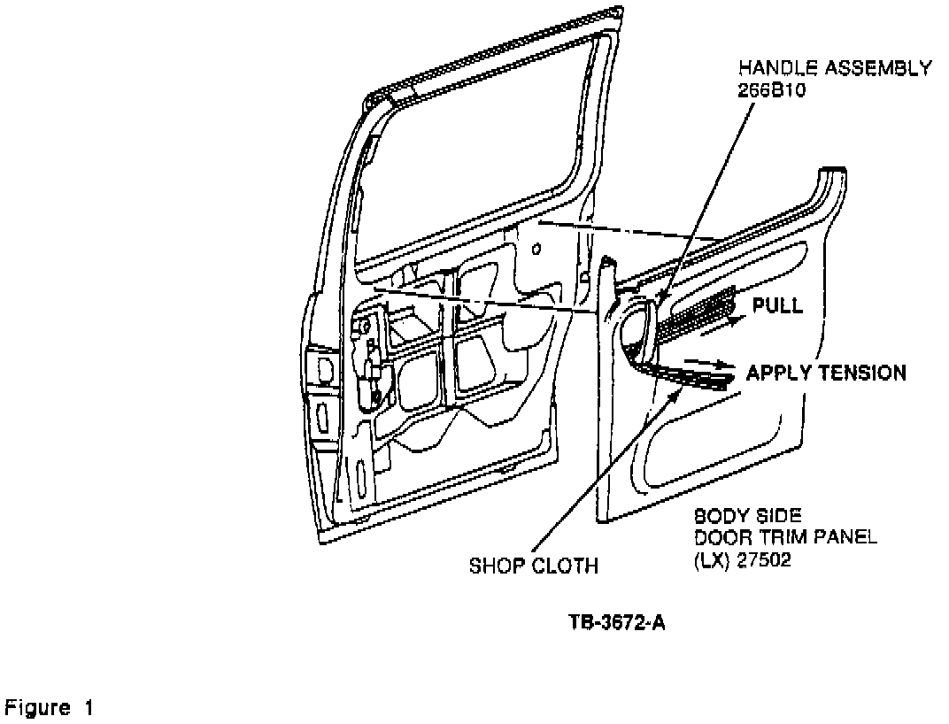IF A CIRCLIP TOOL IS NOT AVAILABLE, A PIECE OF CLOTH CAN BE WRAPPED OVER THE DOOR HANDLE LEVER PIVOT AND USED TO CATCH THE CIRCLIP WITH A ROPE PULLEY ACTION, FIGURE 1.