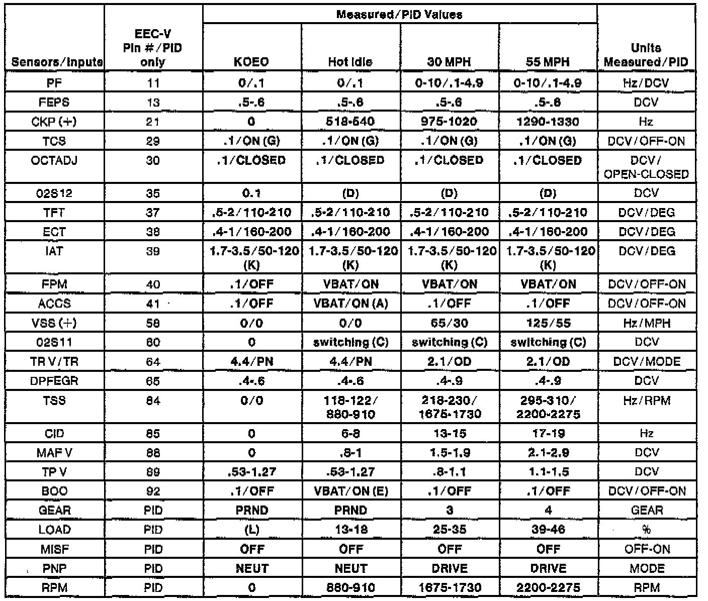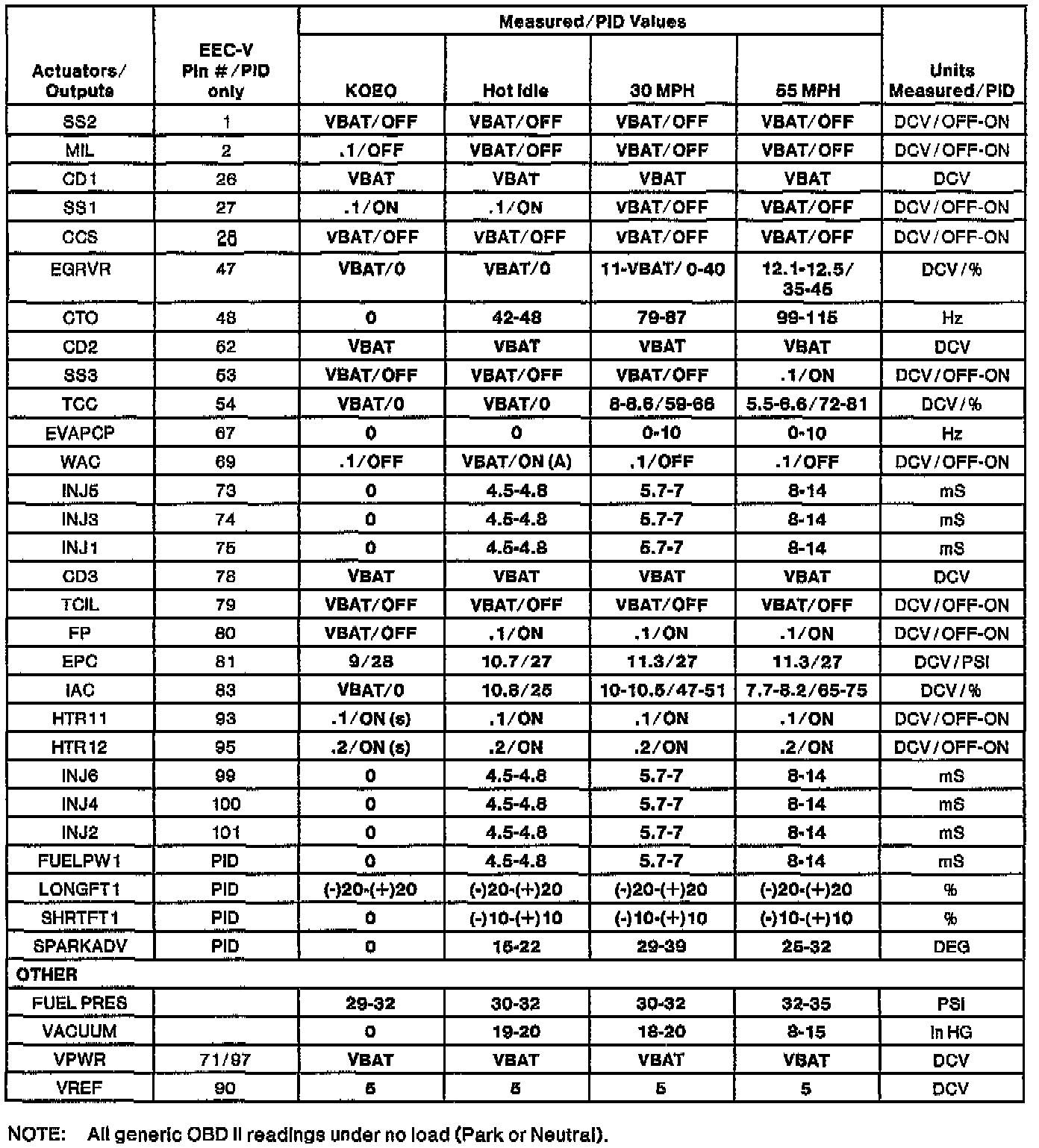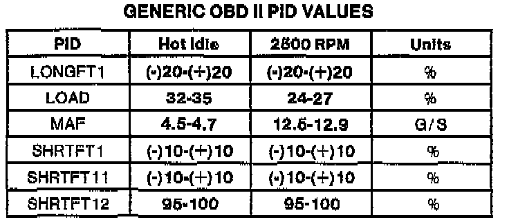 NOTE: All generic OBDII readings under no load (PARK or NEUTRAL).