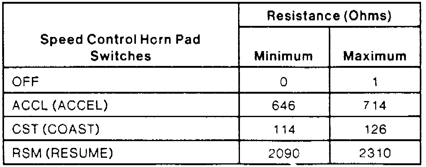 3. Disconnect speed control wiring harness at steering column connector, then repeat previous resistance checks at steering column connector.