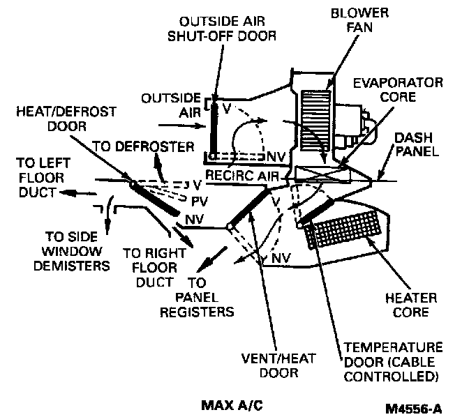 In the MAX A/C position, all doors are in the vacuum position with the exception of the HEAT/DEFROST door. Outside air is shut off and the passenger compartment air is recirculated to maximize cooling.