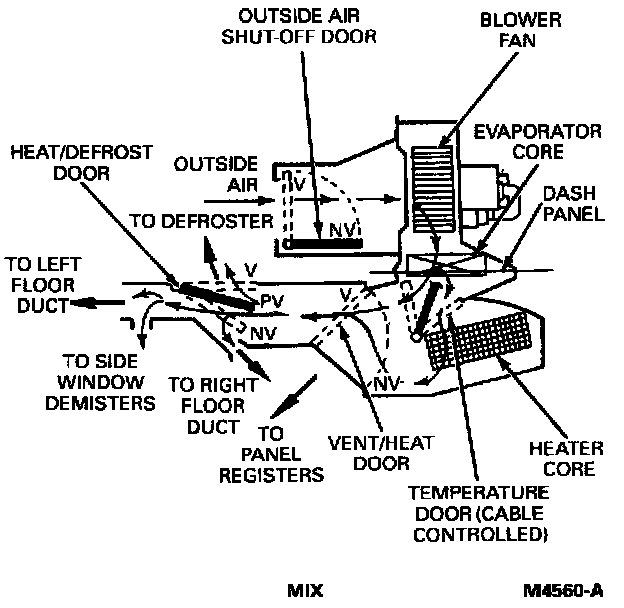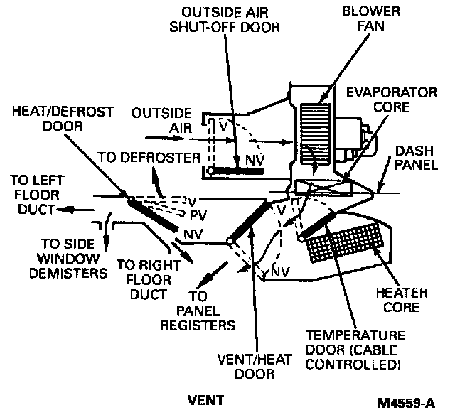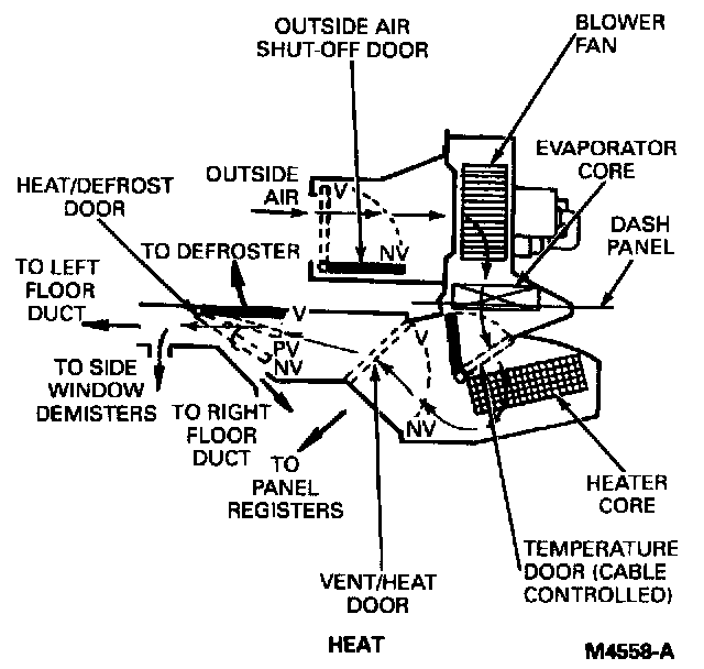 In the HEAT position, no vacuum is applied to the vacuum control motor and the outside/recirc. door is open to the outside. Air is discharged through the heater outlet floor duct with a small amount going to the windshield defroster hose nozzle.