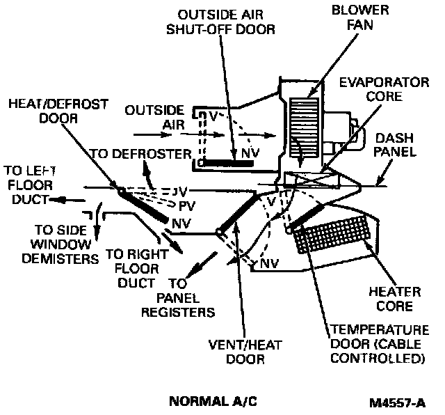 In the NORM A/C position, outside air is allowed to enter the passenger compartment. The air passes through the A/C evaporator core and is cooled before reaching the passenger compartment.