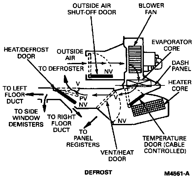 In the DEFROST position, outside air is discharged through the windshield defroster hose nozzle with a small amount going to the heater outlet floor duct.