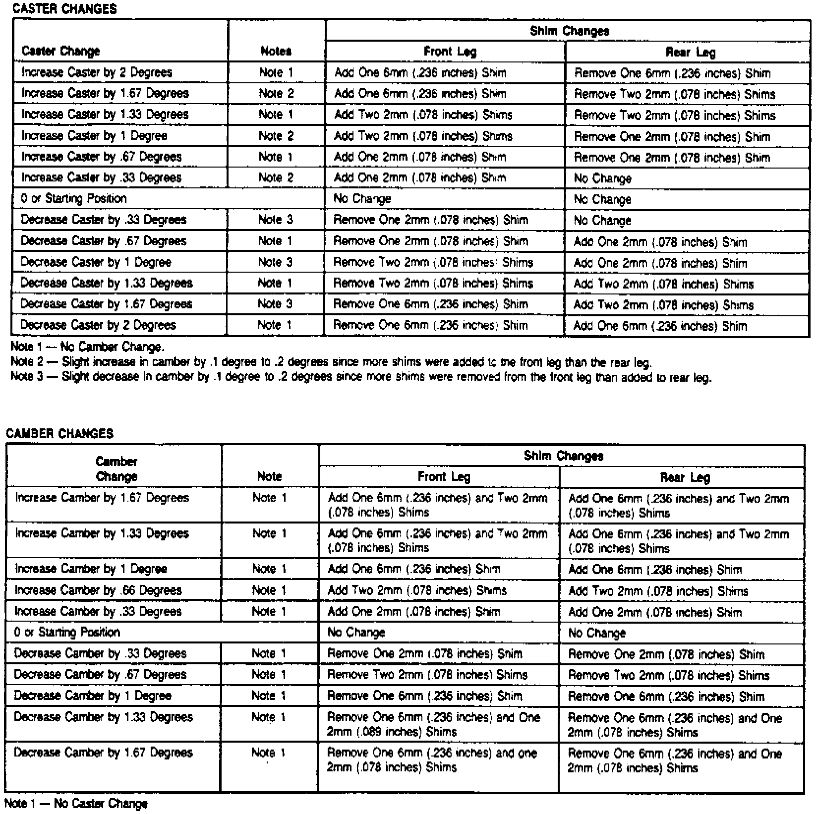NOTE: If an unequal number of shims is added or subtracted to the front or rear legs of the upper control arm, both caster and camber settings will be revised. Refer to the Caster/Camber Variation Chart, when adjusting camber and caster to specification.