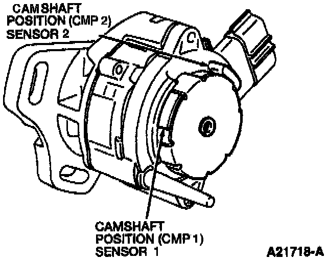 Two Hall Effect type Camshaft Position Sensors (CMP) are used. CMP1 detects when number one cylinder is at top dead center. CMP2 sends a signal for each 1/4 camshaft revolution. This information is sent to the Powertrain Control Module (PCM), where it is used to control fuel injection timing.