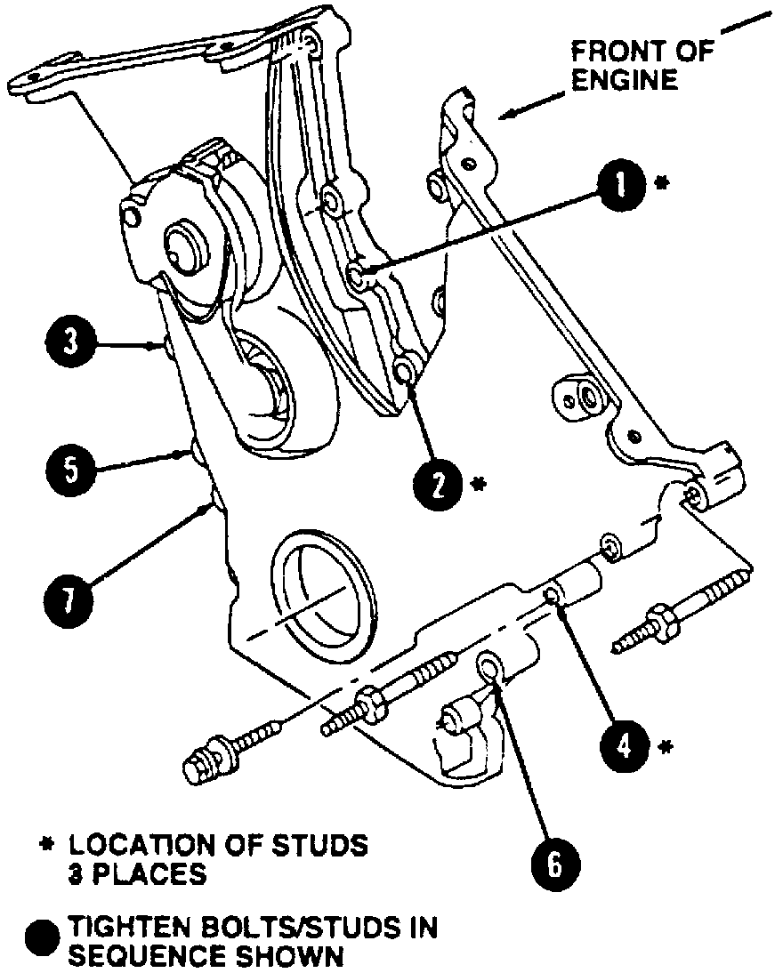 5. Install remaining front cover bolts and stud bolts, then torque all front cover bolts and stud bolts in sequence to 15-22 ft lb.