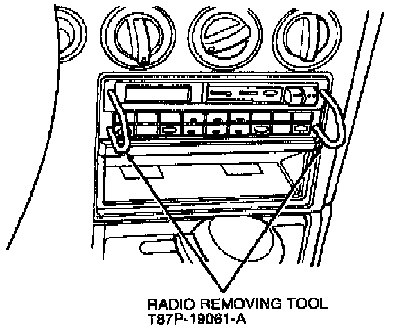 2. Install Radio Removing Tool T87P-19061-A into radio face plate or digital audio compact disc player face plate. Push tool in approximately 25.4 mm (1 inch) to release retaining clips.