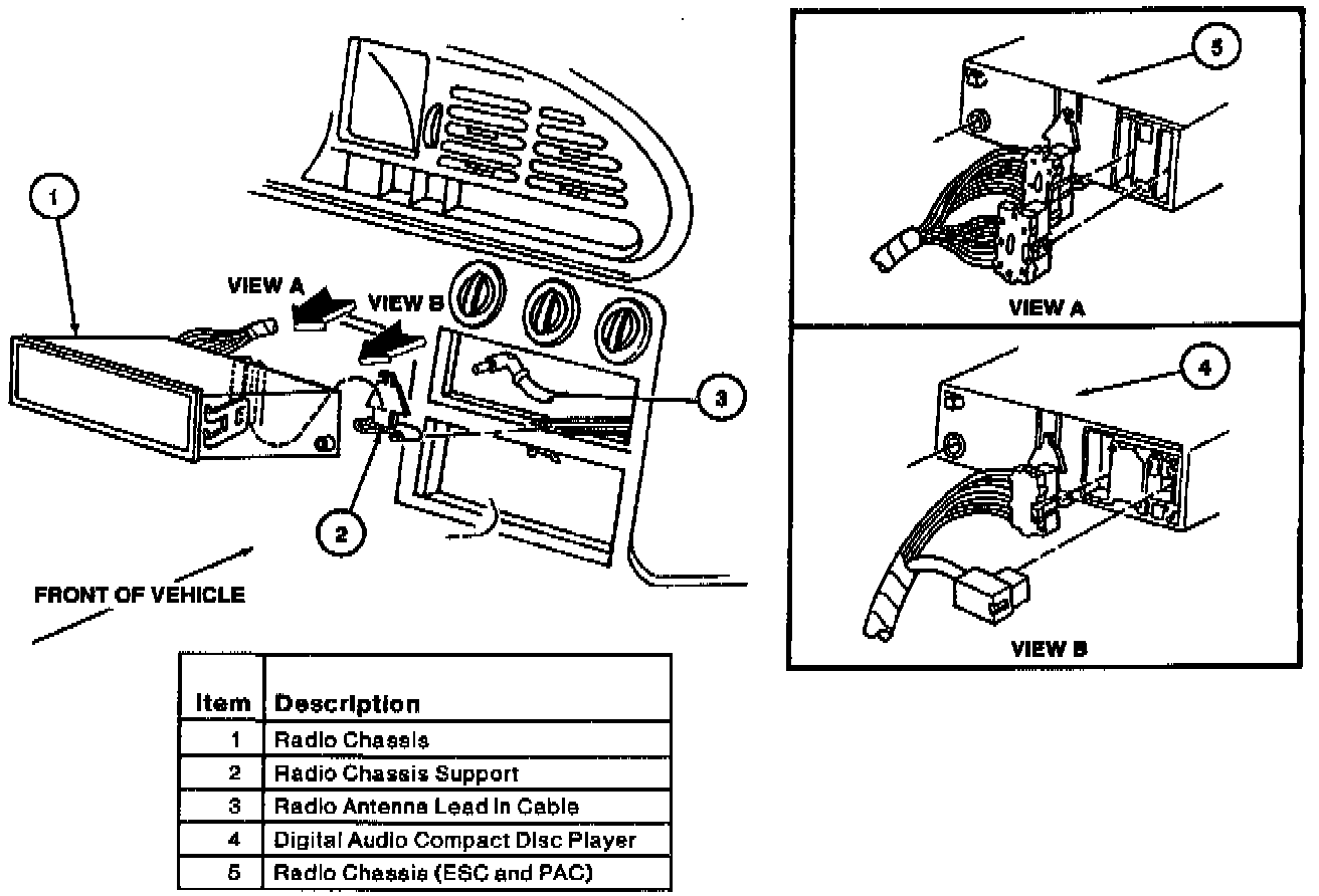 4. Disconnect the connectors and remove the radio chassis and/or digital audio compact disc player.