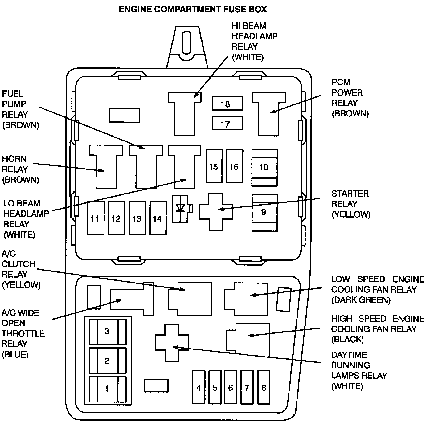 The PCM Power Relay is located at the LH front of the engine compartment, in the engine compartment fuse box.