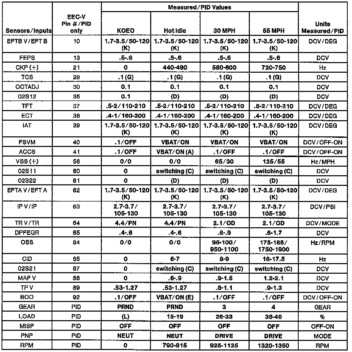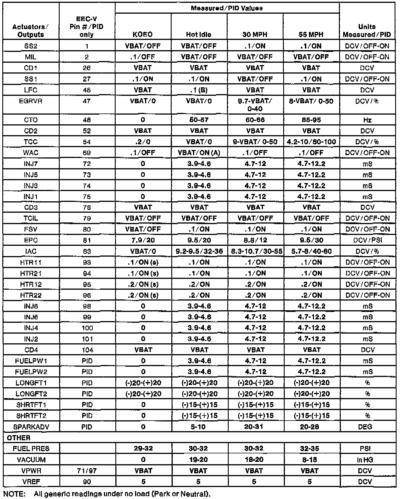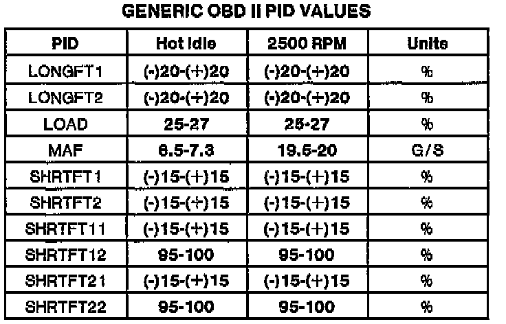 NOTE: All generic OBDII readings under no load (PARK or NEUTRAL).