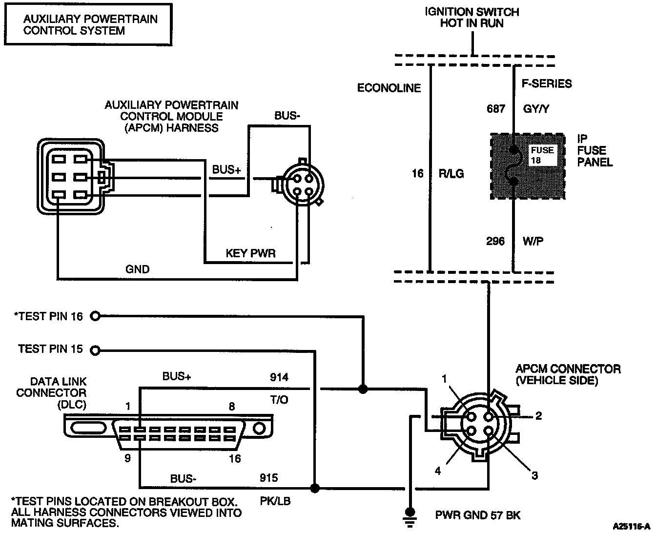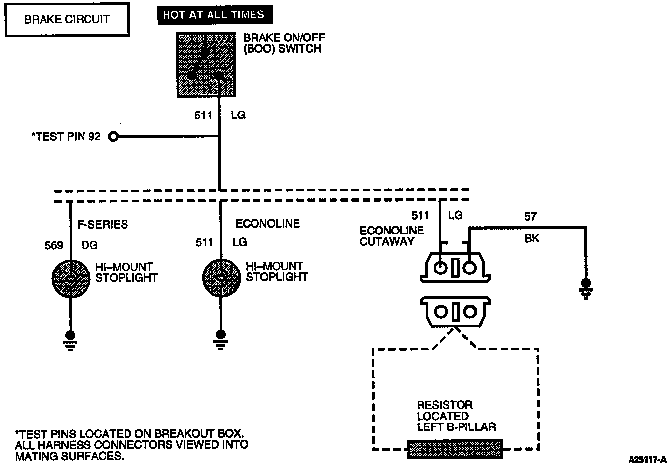 - Harness circuits: KEY PWR, GND, BUS+, BUS- and hi-mount stoplight circuit 569 (DG) for F-Series or 511 (LG) for Econoline
