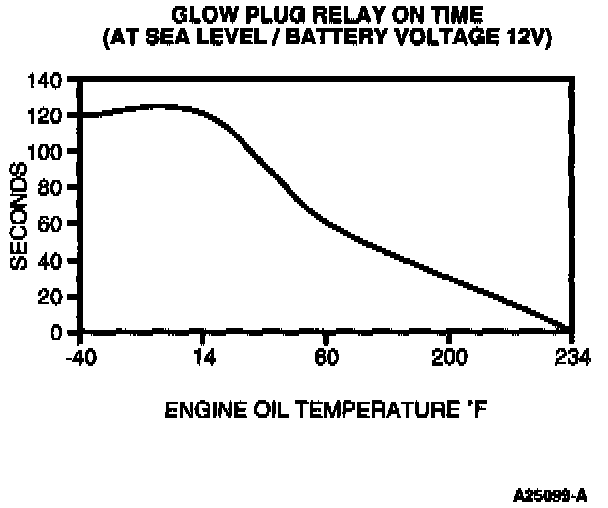 4. Compare the times measured to the table (time will be affected by engine temperature, battery condition and vehicle altitude). The voltage at the glow plug feed terminal may vary from 9 to 12 volts depending upon battery condition.