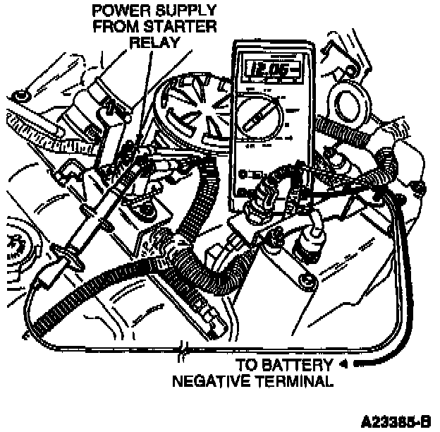 RELAY OPERATION1. Install a Digital Volt-Ohmmeter (DVOM) on the glow plug feed side of the glow plug relay (large stud with two wires connected).