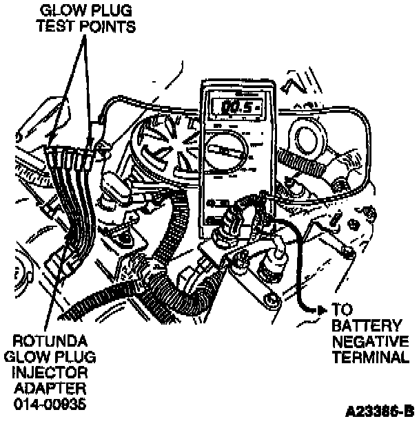 2. With the Rotunda Glow Plug Injector Adapter 014-00935 or equivalent installed, measure glow plug resistance to ground (preferably B-).