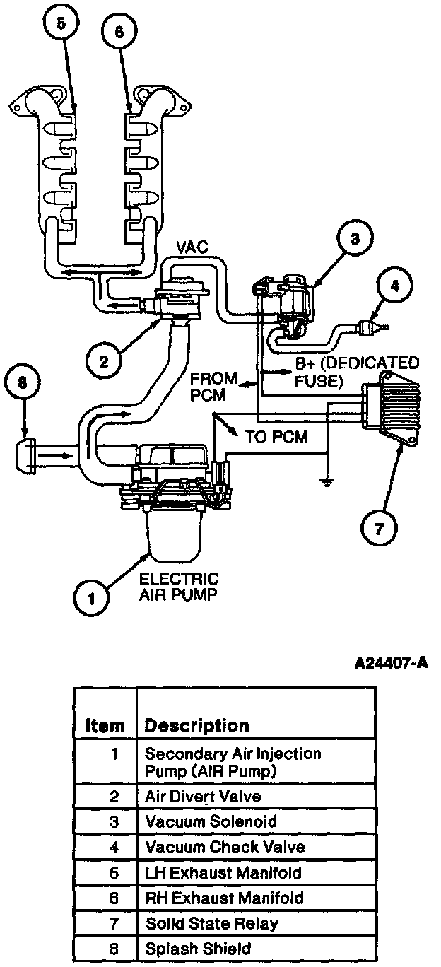The Electric Secondary Air (AIR) System consists of an Electric Air Pump (EAP), a combination Check and Air Diverter (AIRD) valve(s), an AIR Bypass solenoid, A Solid State Relay (SSR), Powertrain Control Module (PCM) and connecting wires and vacuum hoses.