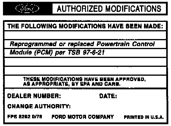 Obtain an Authorized Modification Decal (FPS 8262 - obtainable through DOES II, 25/pkg) and list the date, dealer number, and summary of modifications performed. Select a prominent place adjacent to the Vehicle Emission Control Information Decal suitable for installing the Authorized Modifications Decal. Clean the area, install the decal, and cover it with a clear plastic decal shield.