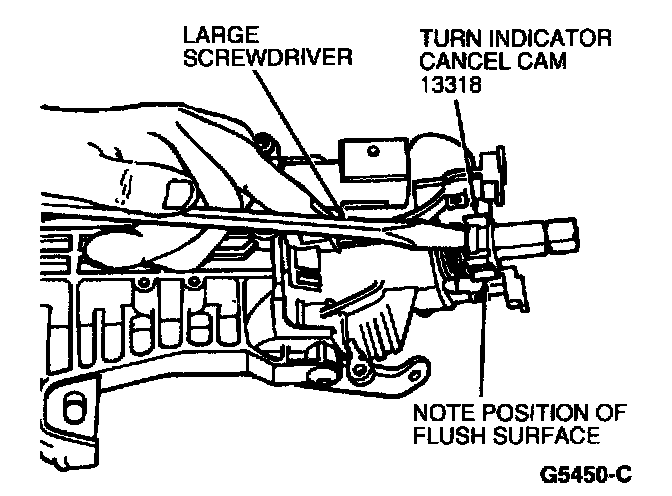 5. Remove turn indicator cancel cam by pushing up with flat-bladed screwdriver. Note direction of flush surface.