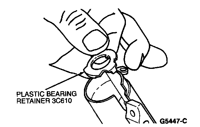 9. Remove plastic bearing retainer from ignition switch lock cylinder bore. Replace if damaged.