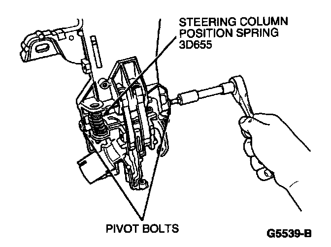 12. Remove two tilt pivot bolts. Use caution as steering column position spring will release when bolts are removed. Remove steering column lock cylinder housing.