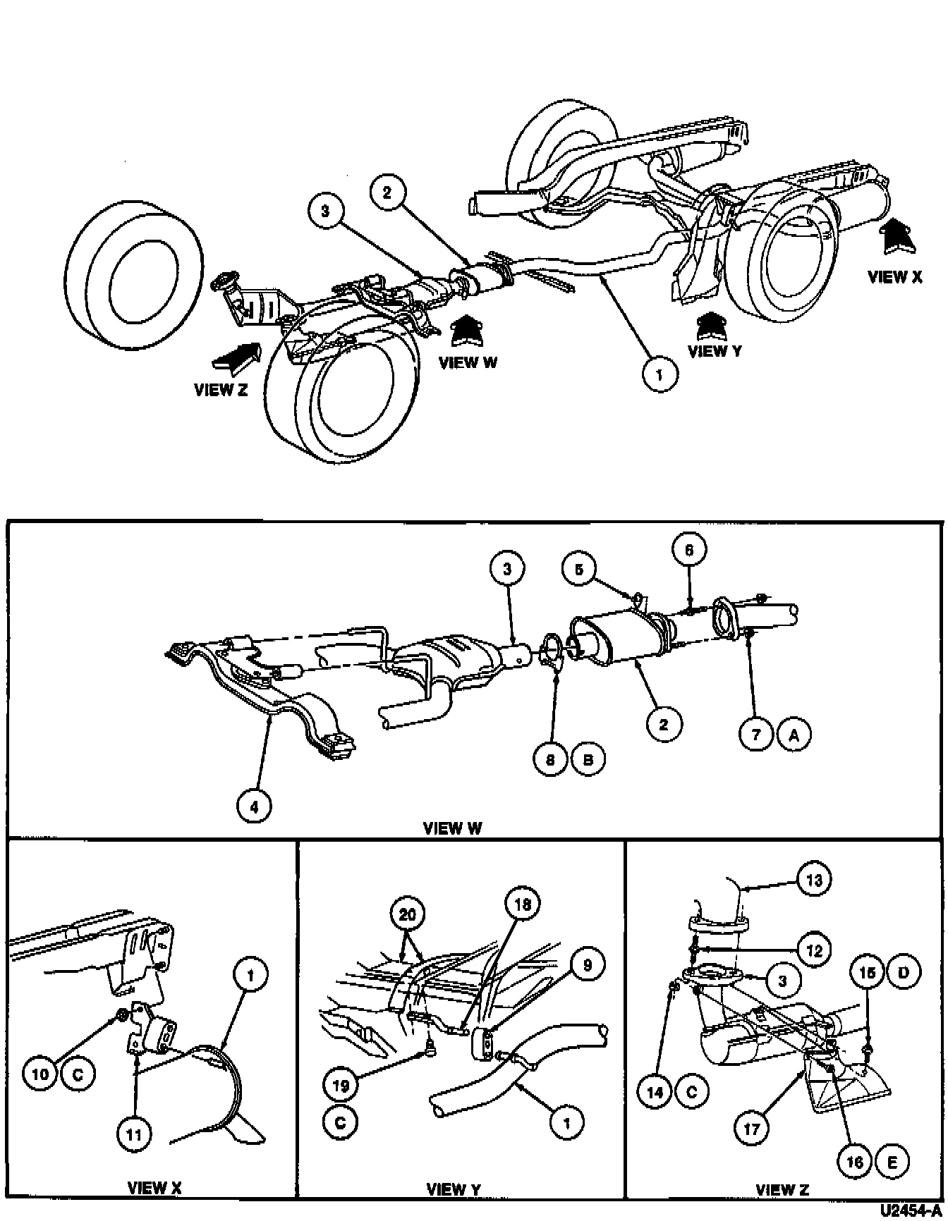CAUTION: When servicing exhaust system or removing exhaust components, disconnect all heated oxygen sensors (HO2S) at the wiring connectors to prevent damage to the heated oxygen sensors and wiring harness.