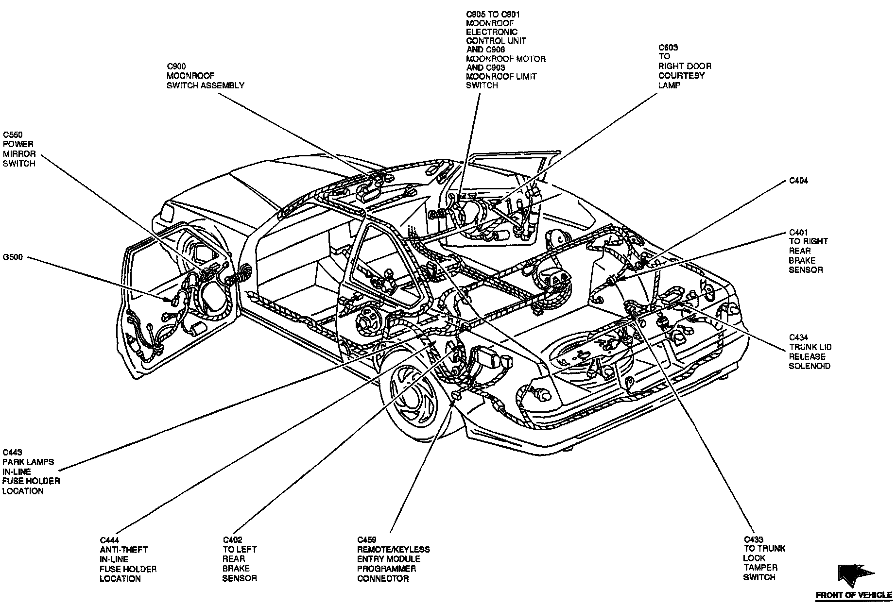 The Program Connector is a two-pin connector located on LH side of luggage compartment, near remote entry module, above the wheel well, in the trim panel assembly.