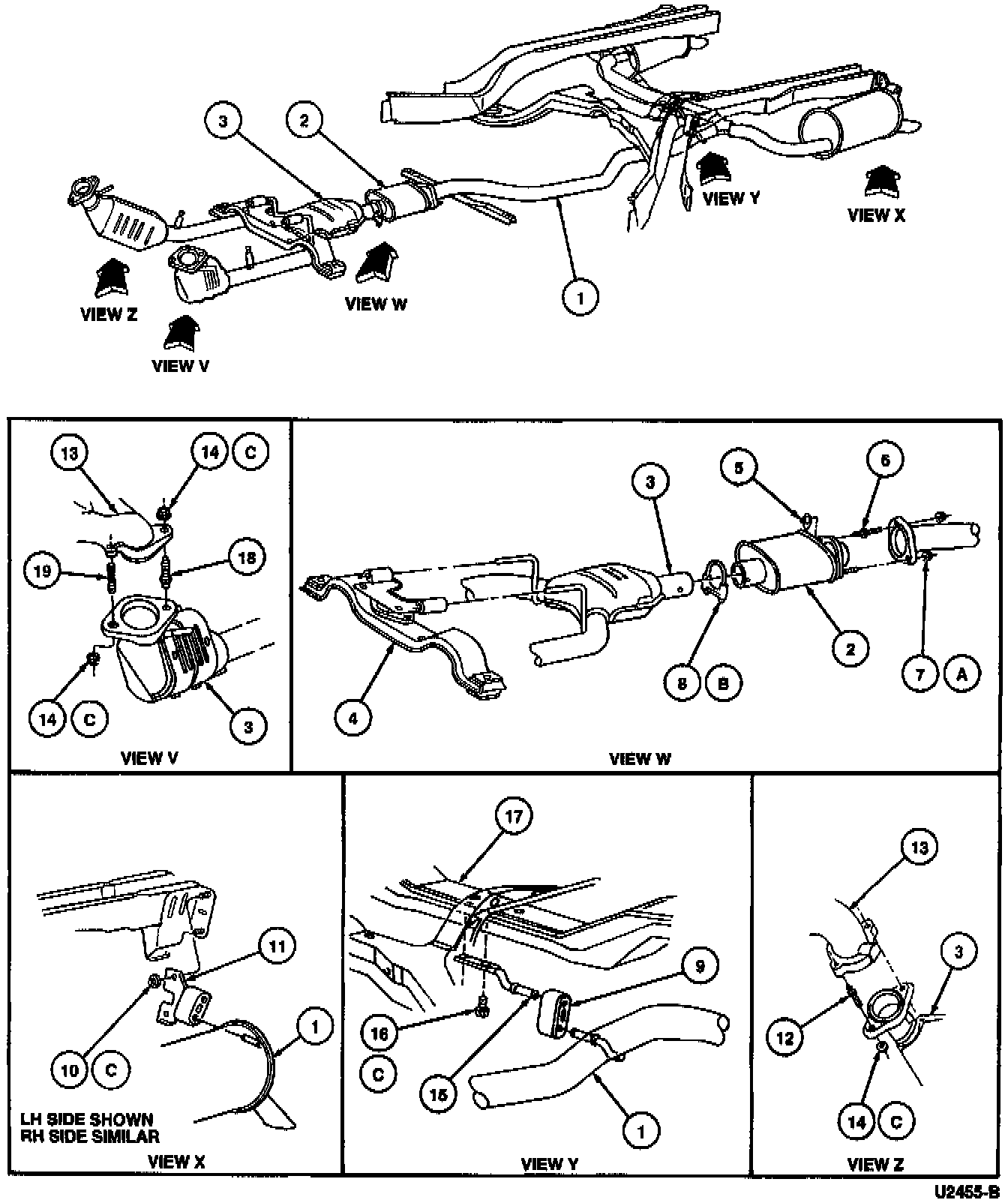 5. Remove four nuts retaining dual converter Y pipe flanges to the exhaust manifolds.